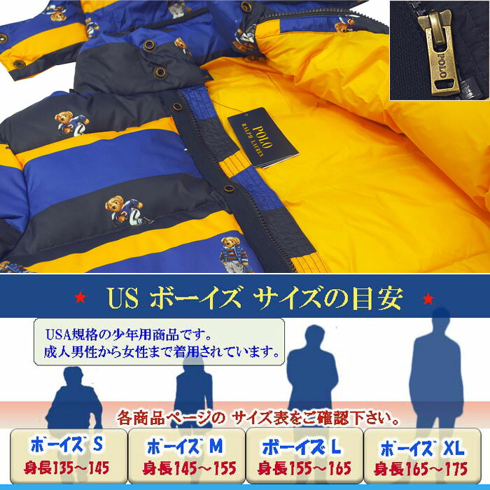 原産国 ベトナム 素材 表地、ポリエステル 100%、ダウン 75%、フェザー 25%、 サイズ表(単位cm) サイズ USボーイズ S USボーイズ M USボーイズ L USボーイズ XL 胸囲 90cm 98cm 106cm 114cm 着丈 54cm 55cm 61cm 67cm 袖丈 49cm 52cm 57cm 62cm 肩幅 37cm 38cm 42cm 44cm 適用身長 135〜 145cm 145〜 155cm 155〜 165cm 165〜 175cm サイズについては実際の商品を測っています。