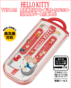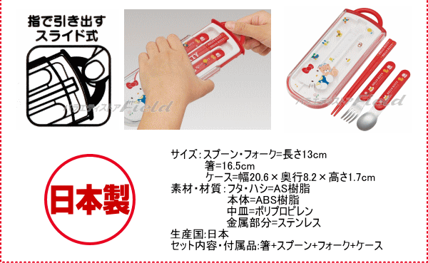 HELLO KITTY トリオセット TCS1AM ■食洗機対応スライド式トリオセット TCS1AM ・サイズ スプーン・フォーク=長さ13cm 箸=16.5cm ケース=幅206×奥行82×高さ17mm ・素材・材質: フタ・ハシ=AS樹脂 本体=ABS樹脂 中皿=ポリプロピレン 金属部分=ステンレス ・生産国:日本 ・セット内容・付属品:箸+スプーン+フォーク+ケース ●開封後の返品はお受け出来ませんのであらかじめご了承ください。
